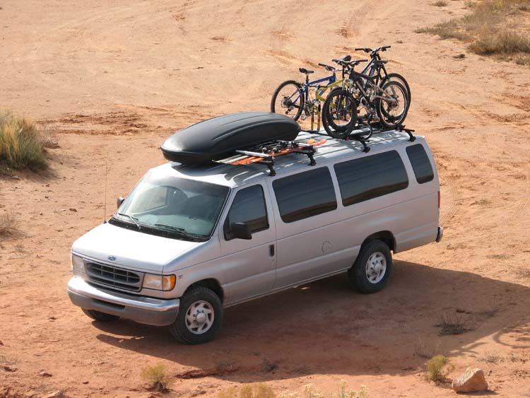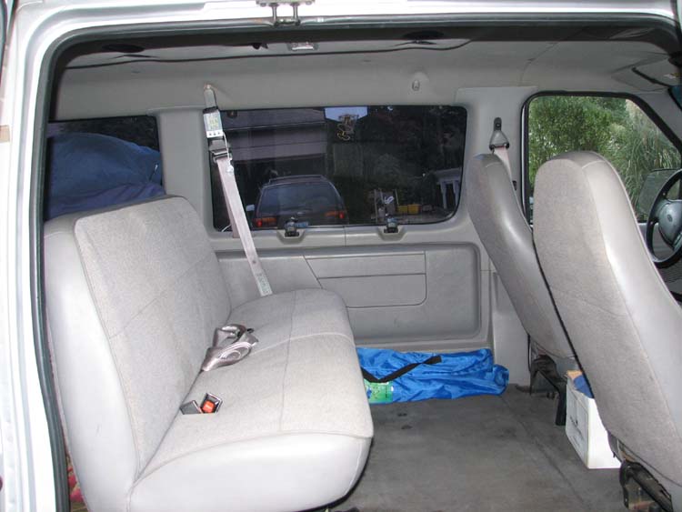 One of the key components to any roadtrip is a vehicle. Since our roadtrip is going to consist of some quality time spent in cold, wet and snowy areas, we needed something we could not only drive but also sleep in. The initial idea was to get a big truck and a trailer. We scrapped that after considering trailer speed limits, gas mileage, narrow roads and the fact that towing a trailer in the snow would be downright scary. After a little more thought, we came up with the biggest van we could find, which turned out to be a Ford 15 passenger van. It's a 1997 with 113,000 miles when purchased. 5.4L V8, Limited slip differential in the rear, and snow tires when the white stuff starts accumulating. The day after we bought it it looked like: